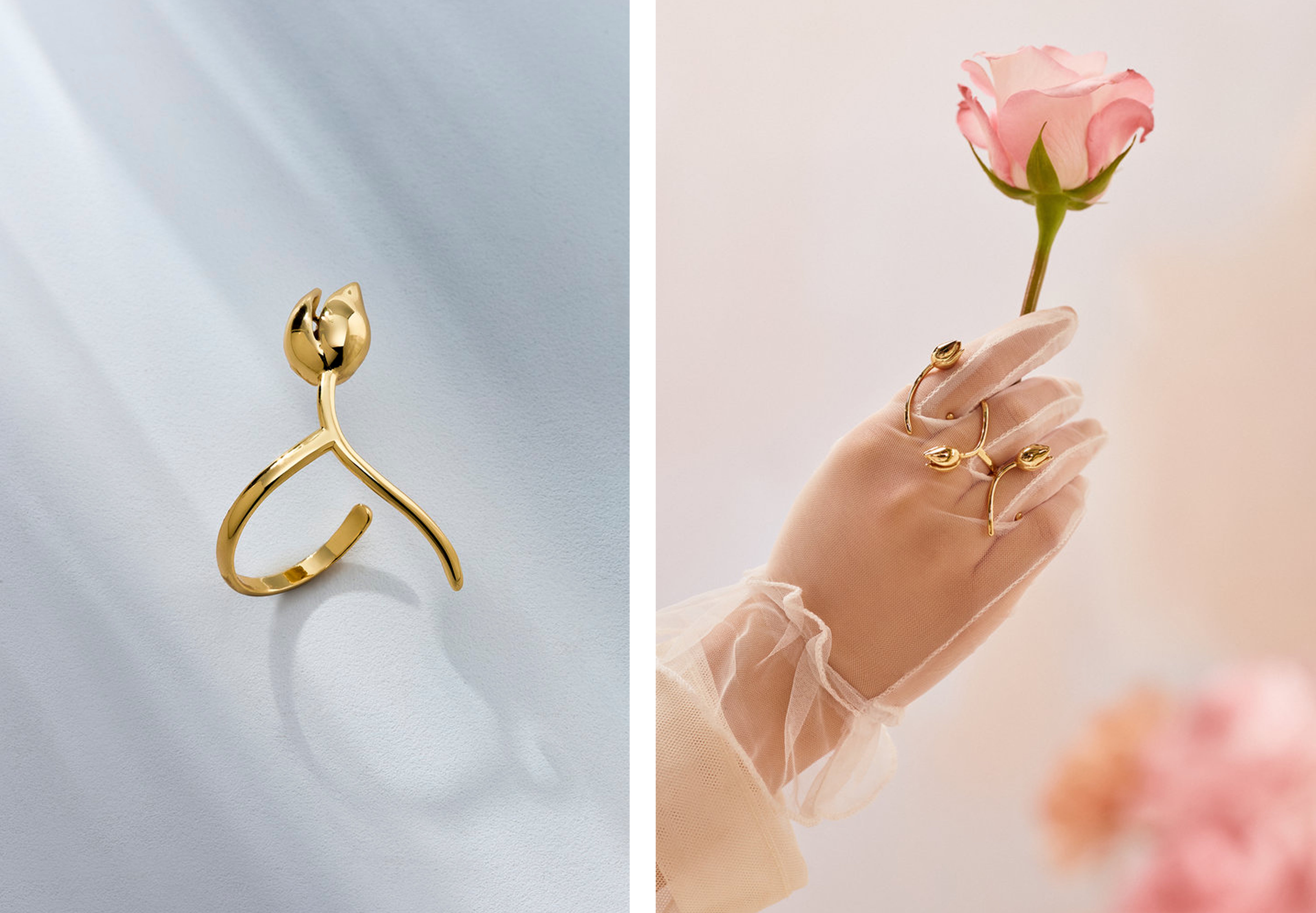 Try wearing the Tulip Ring on your index finger for a powerful look, or on your middle finger combined with thinner, minimalist rings from the collection, creating a mix of textures that enhances the polished finish of the tulip.