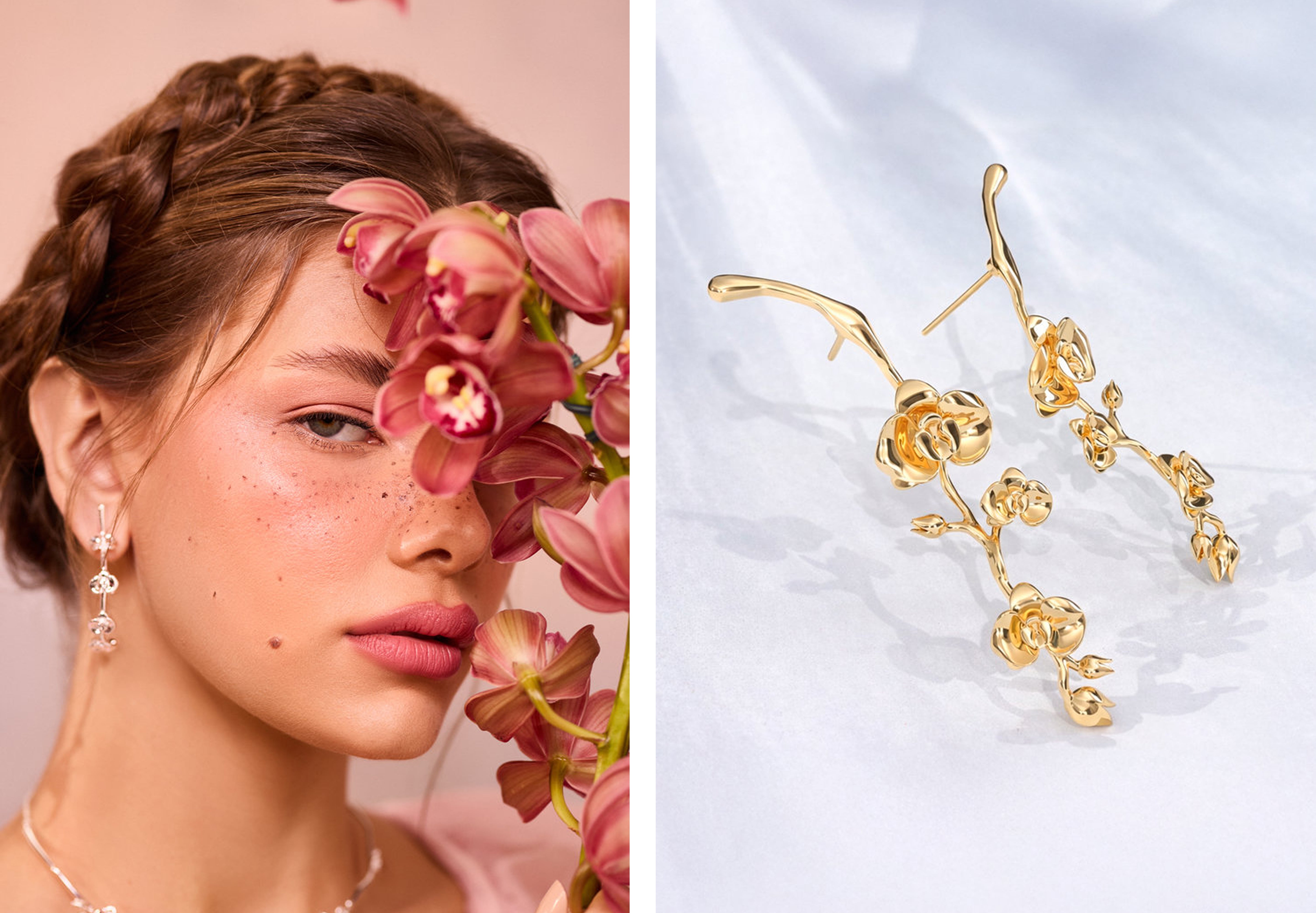 The rarity of the orchid transformed into a jewel. The Floralis earring brings the freshness of flowering branches to delicately frame your face.