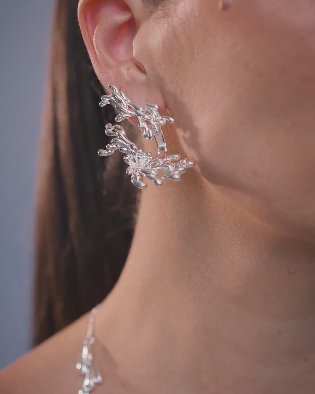 Like a school of fish following the course of the water, this earring wraps the ears in a circular motion, creating a whirlpool of beauty and sophistication. It then changes its course, "transforming" into a pair of rings. Just as the fish flows and follows the current, this piece gives the woman the choice to change the course of her look.