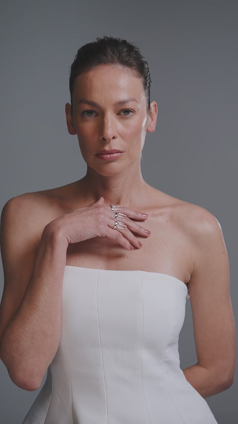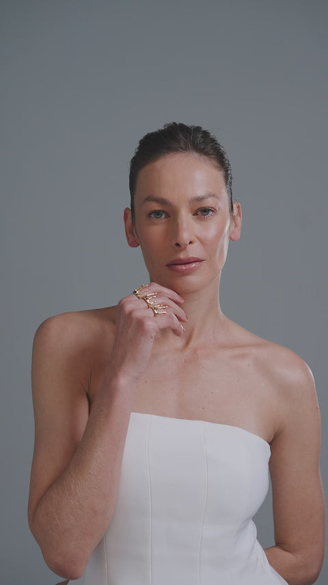 Chuva Ring is a contemporary creation that unites delicacy and sculpture in a single gesture. Its organic design features fine stems rising into delicate rounded points, like raindrops suspended in time. Minimalist and refined, it glides comfortably over the fingers, revealing both delicacy and personality. A piece that blends movement and serenity, perfect for those who value subtle elegance and unique expression.