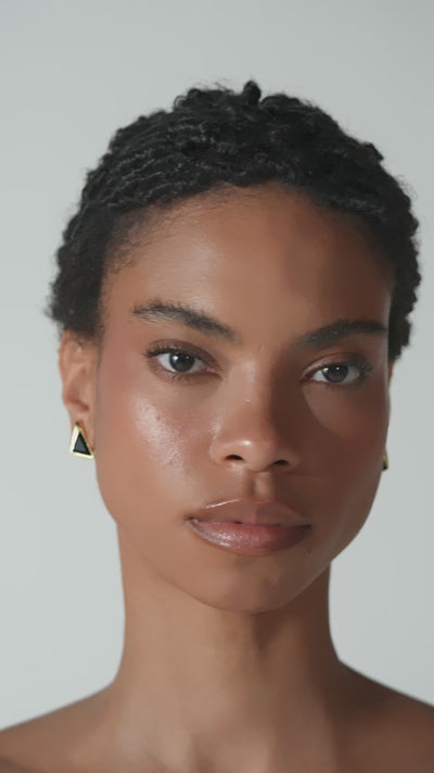 Duality is expressed through the interplay of light and shadow: golden plating with black onyx, and silver with crystal quartz. In a modern reinterpretation of a classic button earring, the design blends timelessness with contemporary forms.