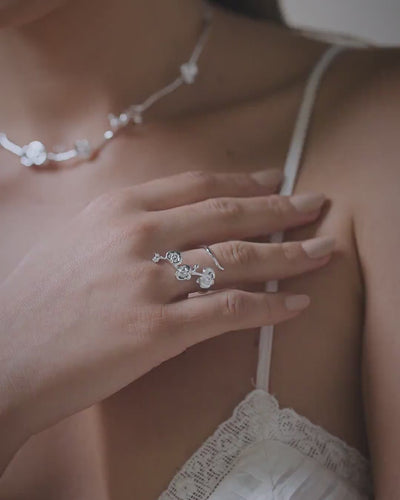 The rare and profound feminine essence symbolized by orchids is the inspiration for the Floralis collection; the rings bring a contemporary romanticism in the form of flowering branches that adorn the hands like a garden.