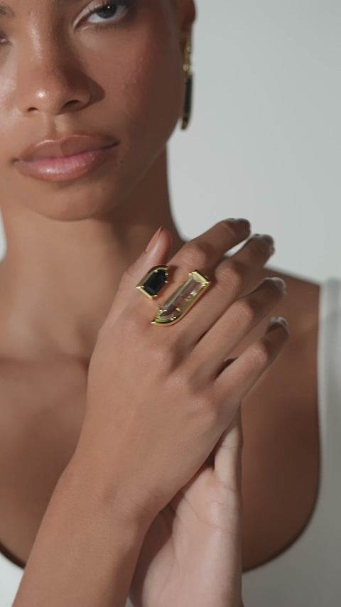 Black onyx and crystal quartz merge in one piece, each with exclusive cuts, embraced by smooth, polished metal plated in gold—the signature DNA of Anna Prata. A fusion of balanced forces, for those who already know they don’t need to choose between one or the other.