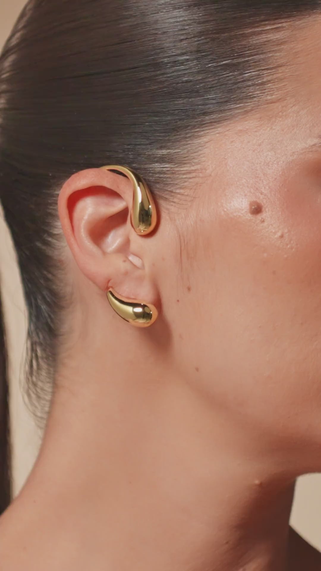A poetic blend of organic metal and liquid fluidity. Drops envelop the ears in an elongated and sophisticated gesture; it can also be worn in its minimal base version.