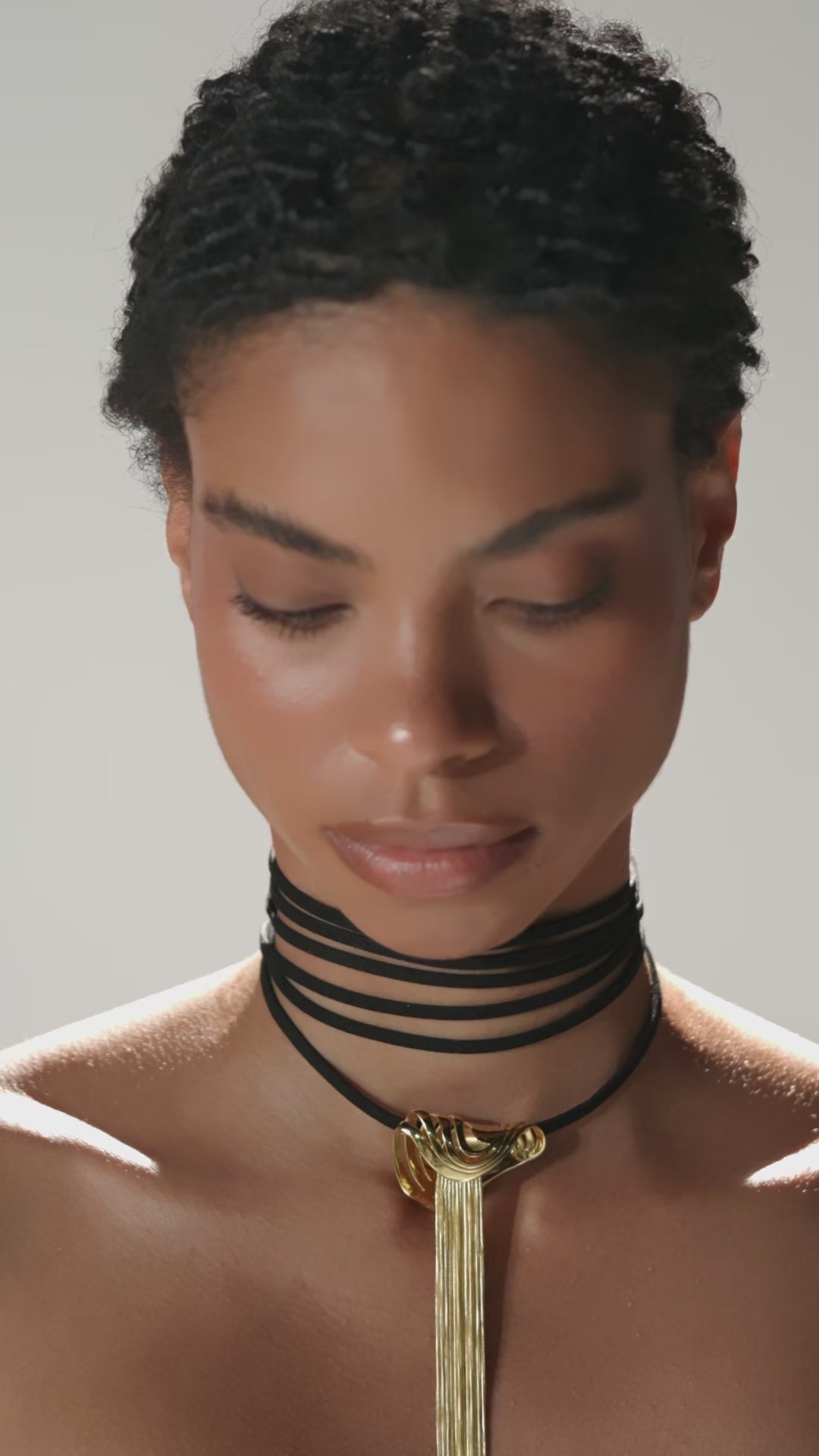 Inspired by what lingers beyond bodily movement, this necklace embodies the invisible traces left in the air—lines in motion yet suspended, as though a fleeting moment were captured in time. Its fluid design translates gestures into poetry. Made of light, polished metal, the piece features a flowing fringe and colored leather strap for adjustment.